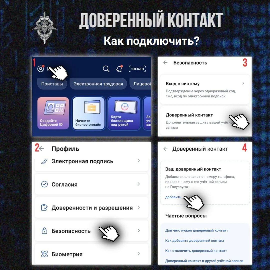 Зайдите в личный кабинет: Профиль Безопасность Доверенный контакт. Выберите близкого человека с подтверждённой учётной записью Госуслуг, укажите его паспортные данные и номер телефона, использованный для регистрации аккаунта.