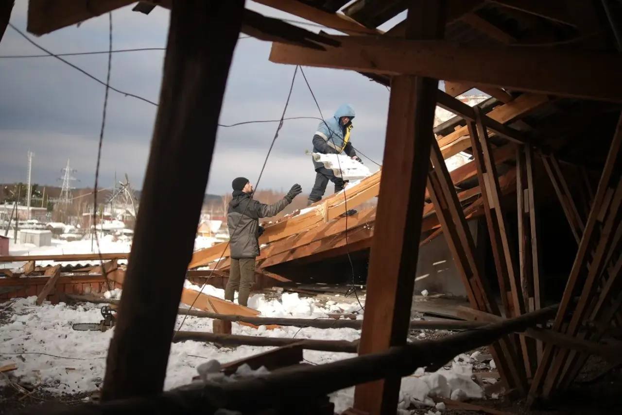 Аварийно-восстановительные работы идут по плану. Расчистка территории от снега завершена. Подрядчик приступил к демонтажу старой кровли.