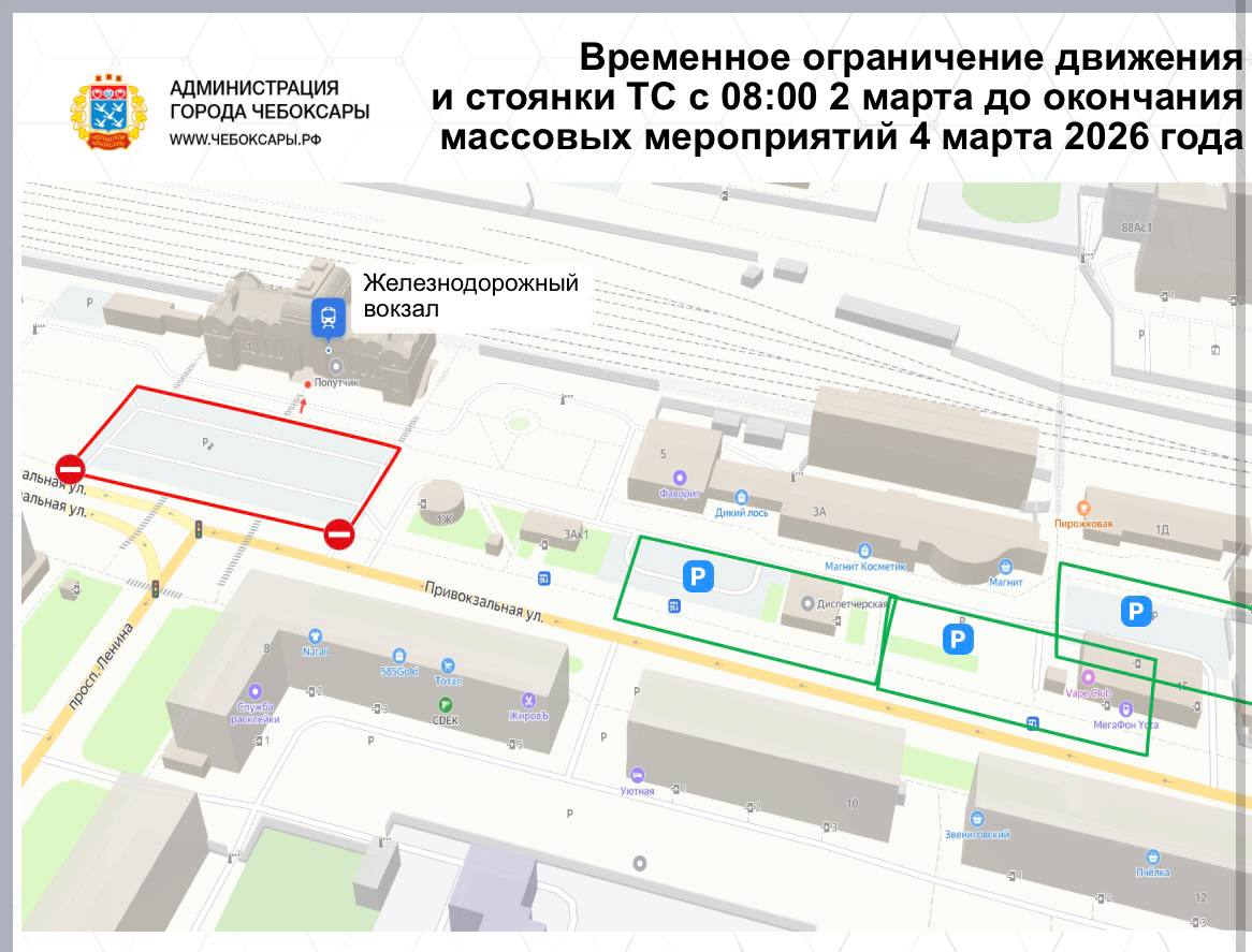 Уважаемые чебоксарцы! В связи с прибываем "Поезда Победы",с 8 утра 2 марта до окончания мероприятий 4 марта ограничено движение и стоянка транспортных средств на площади перед железнодорожным вокзалом (в районе дома № 1 по улице Привокзальная).