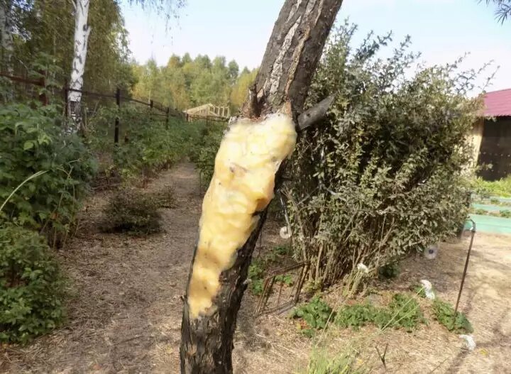 Важно также проверить стволы плодовых деревьев на наличие повреждений от грызунов. Мелкие трещины можно обработать раствором марганцовки и заклеить садовым варом. Если у дерева поврежден весь ствол, потребуется более серьезная мера — прививка мостиком.