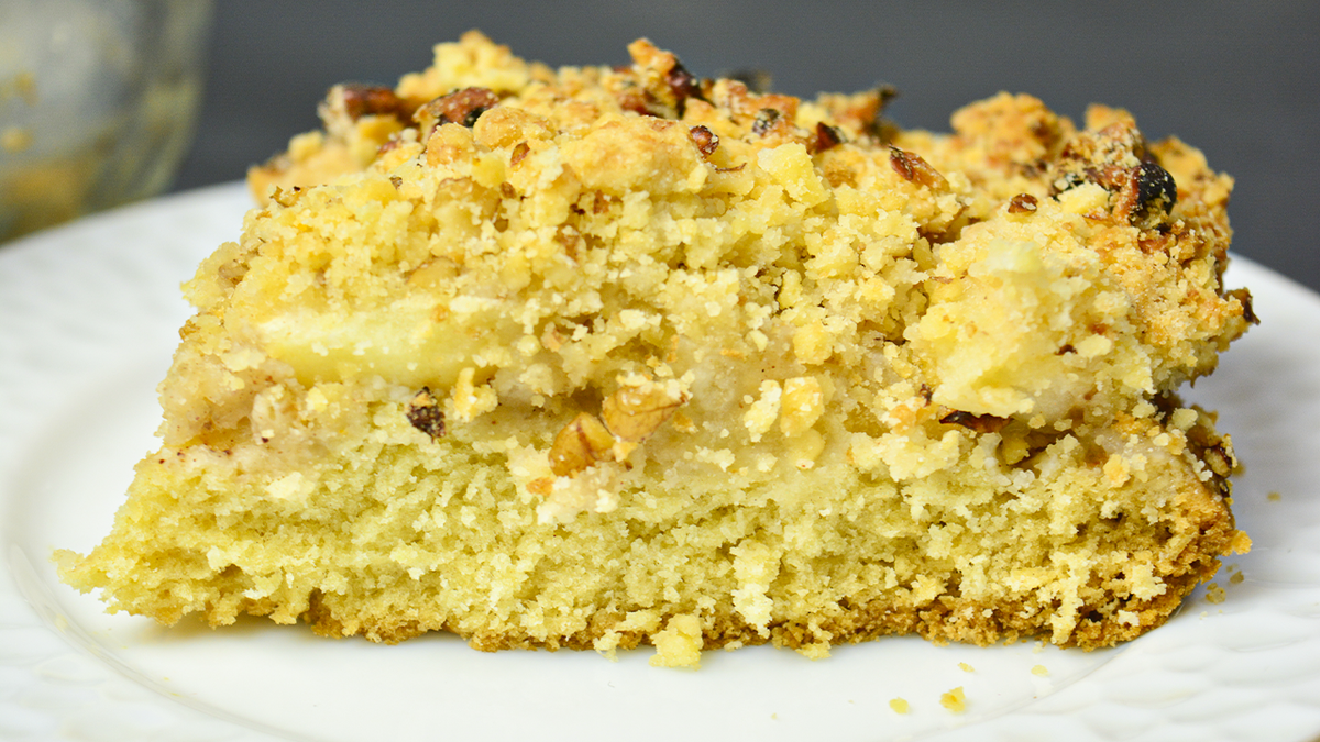 Чтобы сделать песочную верхушку, в отдельной посуде соедините муку, сахар и щепотку соли. Добавьте оставшееся сливочное масло и перемешайте до крошки. В завершение добавьте рубленые грецкие орехи и снова перемешайте. Получившуюся массу распределите по яблочной начинке.