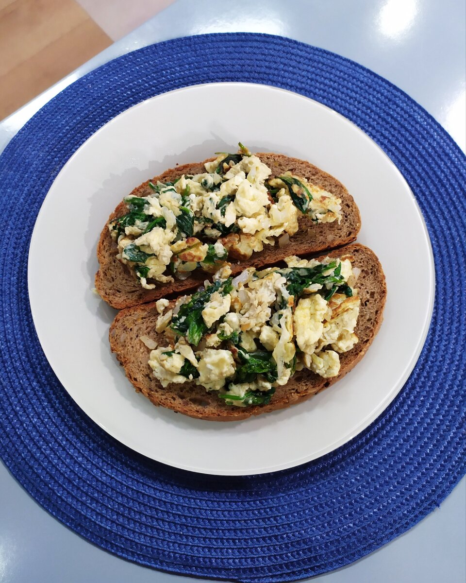 На сковороде раскалить смесь растительного и сливочного масла и обжарить в ней шпинат с луком до мягкости. После этого добавить яйца и жарить, постоянно помешивая, до полной готовности. Не забудьте приправить массу солью и перцем по вкусу.