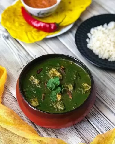 Палак тофу — это сочное индийское угощение с хрустящими кусочками тофу в насыщенном шпинатном соусе, приправленном ароматными специями. Это веганская версия популярного блюда палак панир, где классический панир заменён на тофу, что делает его идеально подходящим для людей, следящих за своим питанием.