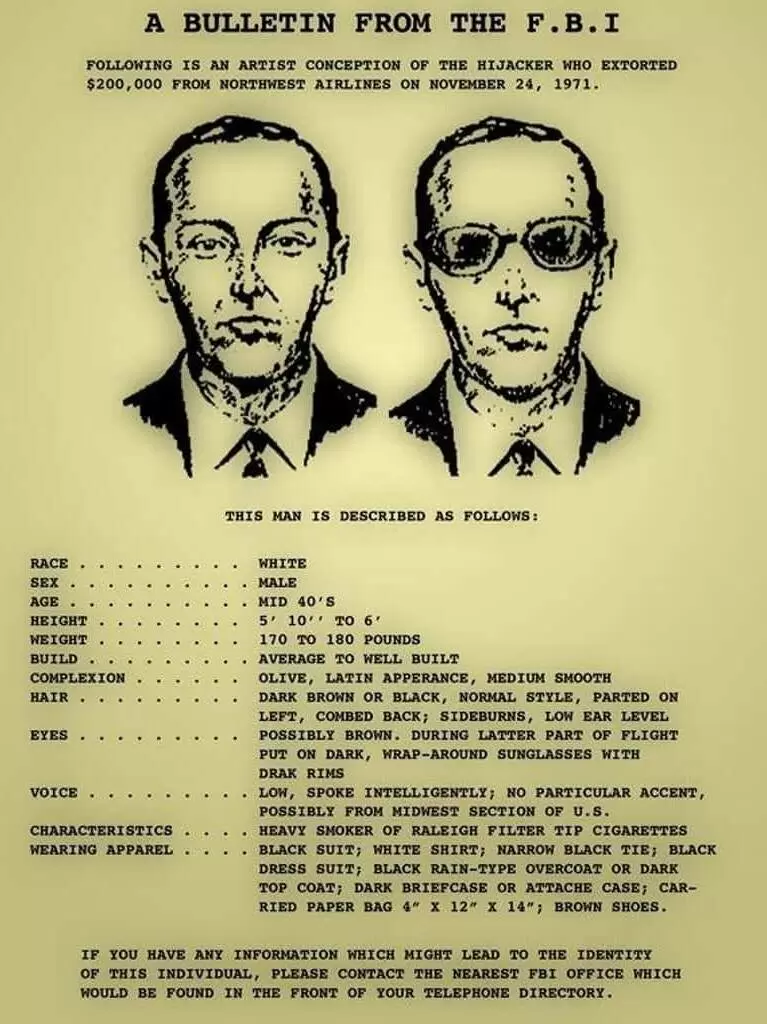 В день своего преступления он потребовал от правительства США 200 000 долларов и два парашюта. Удивительно, но требования были выполнены. По завершении переговора, когда самолет, Boeing-727, пролетал над северо-западным побережьем Тихого океана, Купер с парашютом и деньгами спрыгнул в холодное ночное небо Каскадных гор. С тех пор он бесследно исчез, оставив множество теорий о своей судьбе.