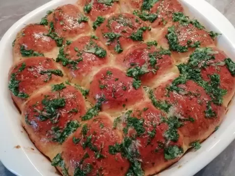 Пока булочки пекутся, следует приготовить чесночную заливку — смешать растительное масло, мелко нарезанный чеснок, зелень и соль. После выпекания, булочки нужно немного остудить и равномерно смазать чесночной заливкой, что придаст им невероятный аромат и вкус.