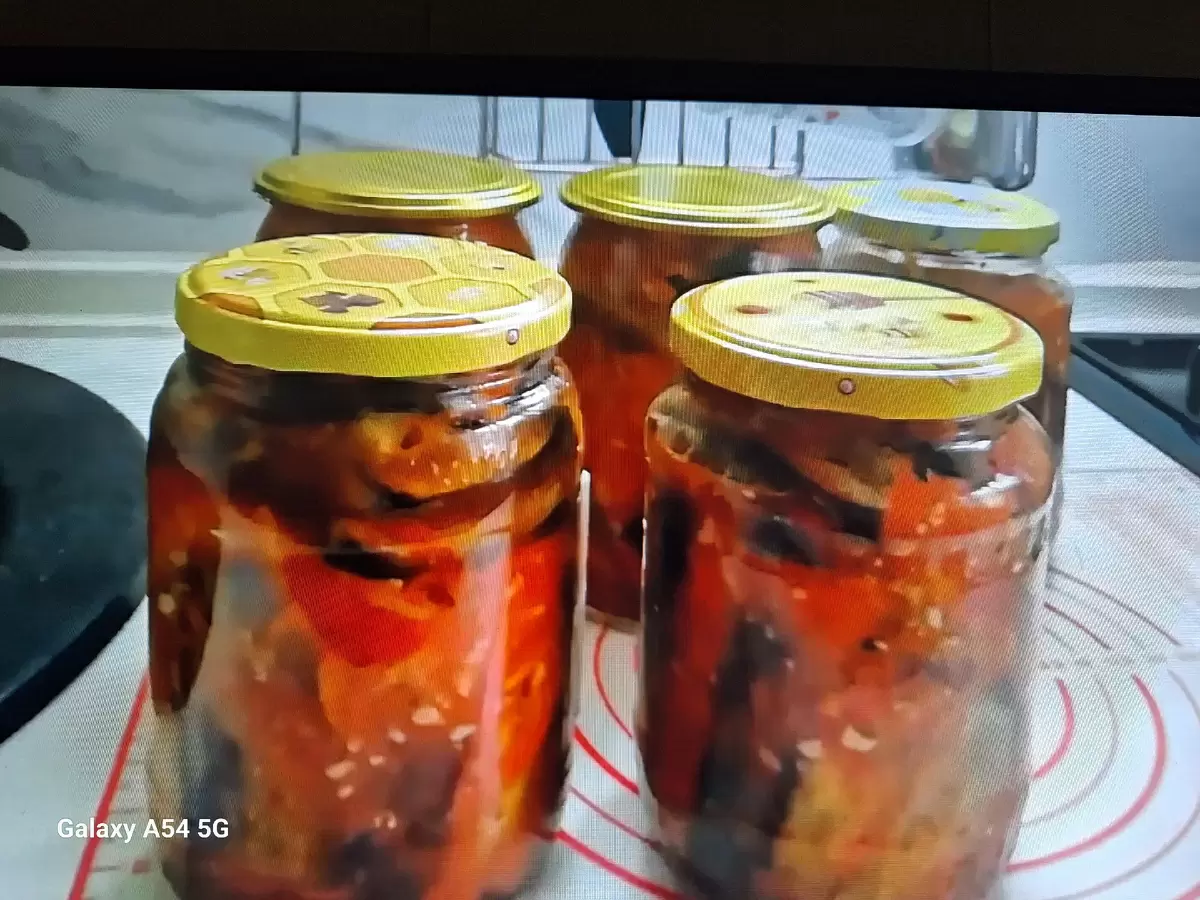 После обжарки остуженные баклажаны помещаются в заранее подготовленные стеклянные банки. Их заполняют до половины, сверху добавляют маринад, аккуратно заполняя все пустоты. Процесс повторяется, пока банки не будут заполнены до краев, после чего их накрывают крышками и отправляют на стерилизацию. В глубокой кастрюле с тканью на дне ставятся заполненные банки, заливаются горячей водой и кипятятся около 20 минут.