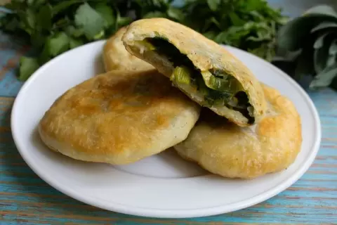 Эти пирожки станут настоящей находкой для любителей веганской кухни, а также для тех, кто соблюдает пост. Начинка для пирожков может варьироваться в зависимости от имеющейся зелени. В основном используется горный лук, который можно заменить шпинатом, щавелем или добавить мяту, кинзу и руколу. Готовые пирожки получаются золотистыми и хрустящими с нежной, насыщенной зеленой начинкой.