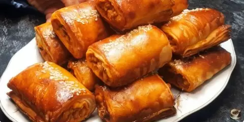 Приготовленное тесто поделить на 4 части, каждую скатать в колобок и раскатать в тонкие лепёшки. Их следует сложить в несколько слоев, смазывая растительным маслом между слоями. Из двух краев накатить начинку, образуя рулеты. Порезать на порционные куски и выложить на противень, смазанный маслом.
