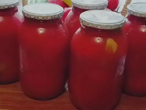 Помидоры предварительно накалываются у плодоножки, после чего их заливают кипятком и оставляют на 15 минут. Затем хрен, чеснок и болгарский перец перемалываются в блендере, и в получившуюся массу добавляется соль и сахар. Этот кисло-сладкий томатный сок кипятится 5 минут, после чего банки наполняются, закатываются и накрываются одеялом до остывания. Такие заготовки идеальны для зимнего стола и подарят тепло ярких воспоминаний о лете в холодный период.