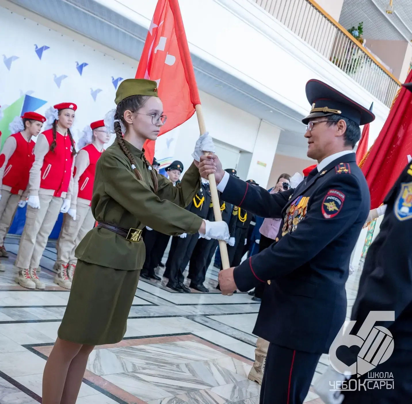 После церемонии награждения почетные гости вручили специально изготовленные копии Знамени Победы школьникам, которые до самого Дня Победы будут нести почетный караул у Знамен в своих образовательных учреждениях.