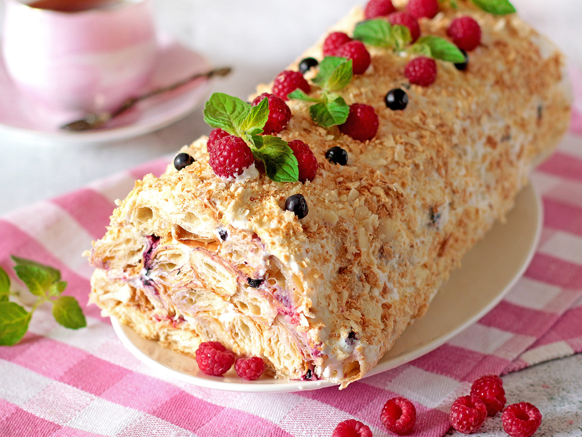 Заверните все в плотный рулет, используя пергамент для удобства. Уберите в холодильник на минимум два часа. После этого разверните его, украсьте остатками крема и крошкой из теста, подрезав края. Вот и все, летний шедевр готов!