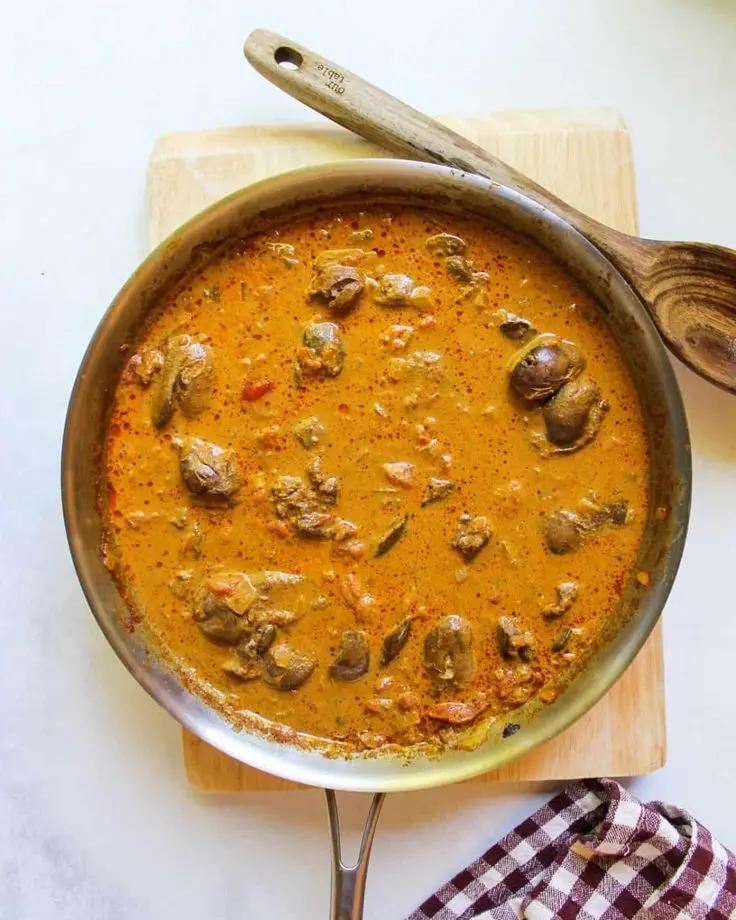 Это пряное и острое блюдо отлично сочетается с отварным рисом или картофельным пюре, создавая идеальную гармонию вкусов.