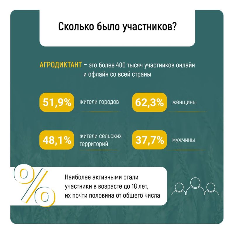 С 8 по 12 октября 2025 года его писали по всей стране – онлайн и офлайн.Более 400 тысяч жителей России, от школьников до экспертного сообщества, приняли участие в акции, чтобы проверить свои знания об агропромышленном комплексе.Максимальные 30...